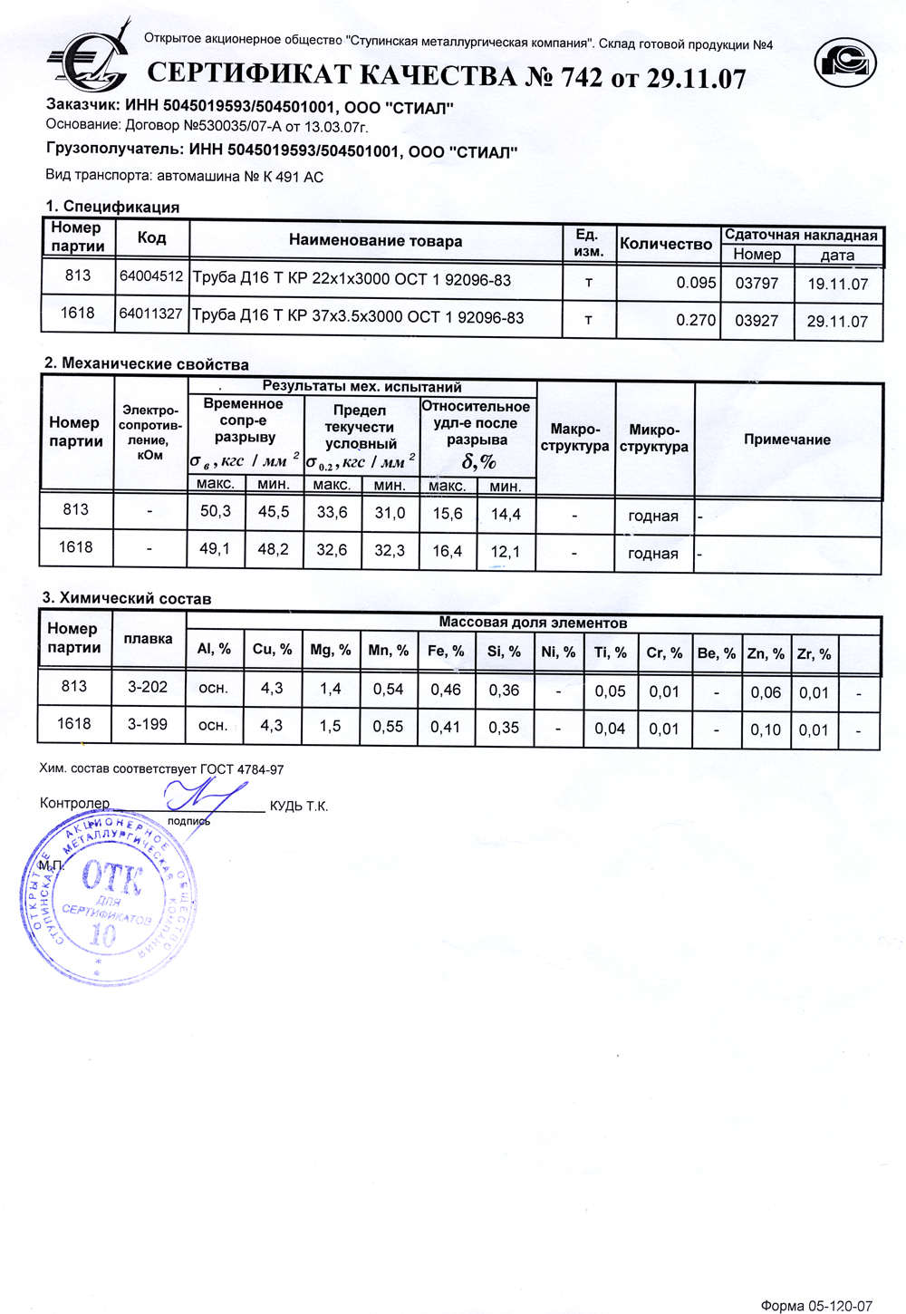 Сертификат качества на трубы, используемые в резервуарах винтовок и пистолетов EDgun